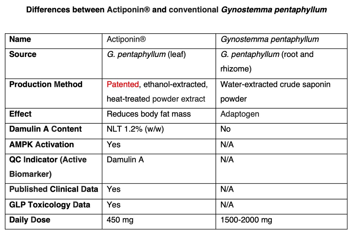 Studies have shown that, in a dose-dependent manner, Damulin A and Damulin B activate AMPK, improve fatty acid β-oxidation, and increase glucose uptake, thereby lowering blood glucose levels. Conventional extracts of G. pentaphyllum take from the plant's root and rhizome, or rootstalks, through a water-extraction process that yields crude saponin powder. By contrast, Actiponin® is ethanol-extracted from the plant's leaf and extensively heat-treated, producing a proprietary powder extract. Through this patented process, Actiponin® becomes enriched with high levels of Damulin A and Damulin B, making it a powerful AMPK activator—and an emerging target for healthy solutions to obesity.